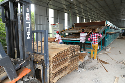 3、成张或成快的单板纵向送进干燥机时,前后板边应重叠1-2厘米,这样可以使单边边部的蒸发速度减小,和中部接近一致,从而防止变形和开裂。